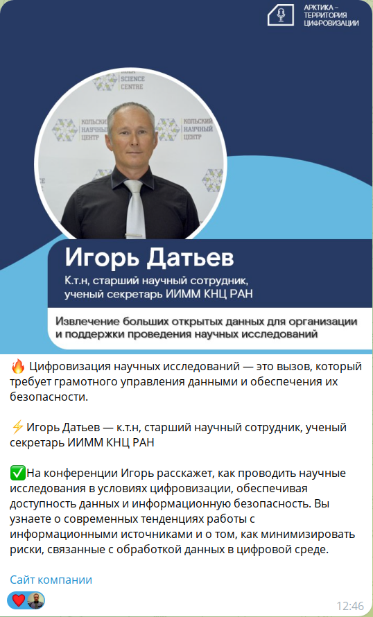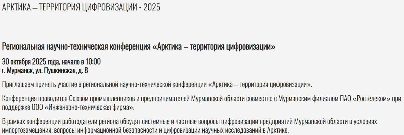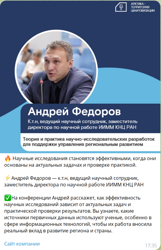 Институт информатики и математического моделирования им. В. А. Путилова представил свое научное видение арктической цифровизации на 4-й Региональной научно-технической конференции «Арктика – территория цифровизации» 31 октября в Мурманске.