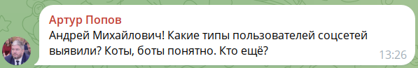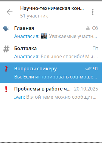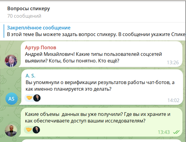 Член Президиума Конференции депутат Мурманской областной думы, председатель Комитета по транспорту, дорожному хозяйству и информатизации Попов Артур Александрович заинтересовался практическим вопросом классификации пользователей социальных сетей. От других участников Конференции прозвучали вопросы о применении в исследовании технологий искусственного интеллекта и способах верификации получаемых таким образом результатах.